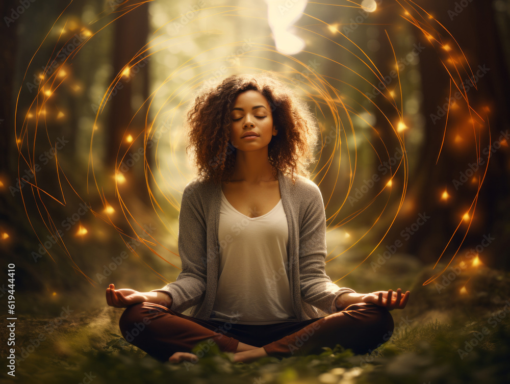 • A woman in lotus pose in the forest, practicing yoga meditation and mindfulness exercises until wellness and awareness. Relaxation time - Generative AI