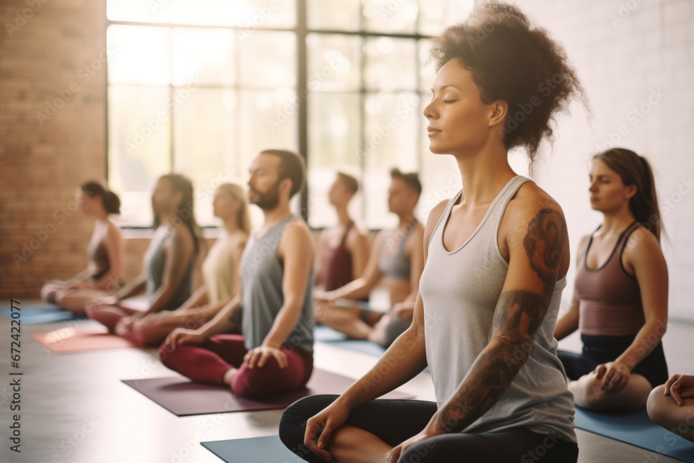 Obraz do Szkoły Jogi - breath exercise and group mediatation in yoga studio, mindfulness, men and women meditating and... #672422077