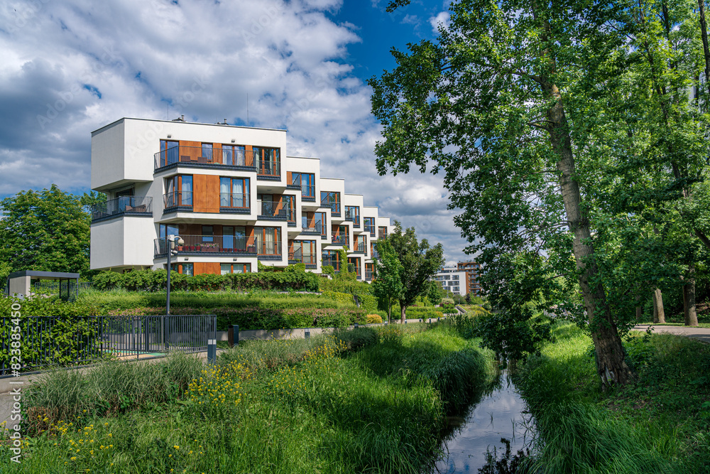 Obraz Architektura - Piękne osiedle mieszkaniowe w niskiej zabudowie w zielonej miejskiej okolicy #823885450