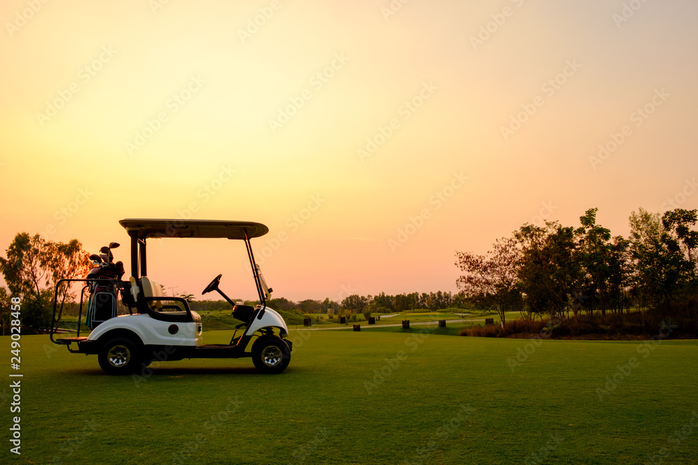 • Golf cart car in fairway of golf course with fresh green grass field and cloud sky and tree on sunset time