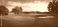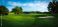 • Panoramic landscape over the lush green fairway, the green, and the sand bunker at sundown