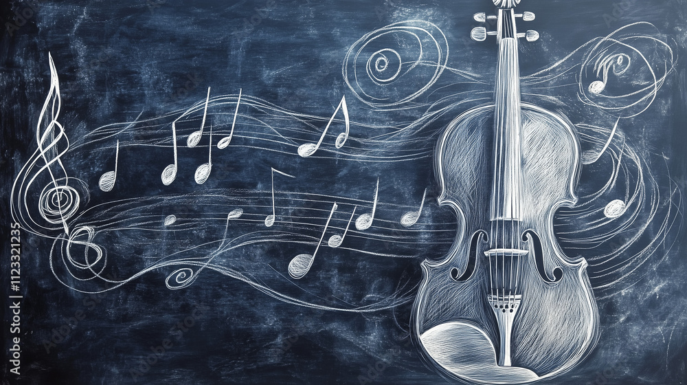 • Artystyczne przedstawienie skrzypiec z nutami i ozdobnymi liniami, wykonane kredą na czarnym tle.