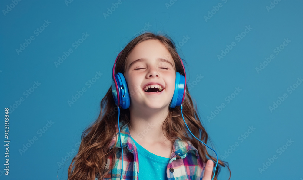Obraz Instrumenty Muzyczne - Portret uśmiechniętej dziewczynki w słuchawkach na niebieskim jednolitym tle #903193848