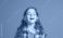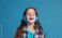 • Portret uśmiechniętej dziewczynki w słuchawkach na niebieskim jednolitym tle