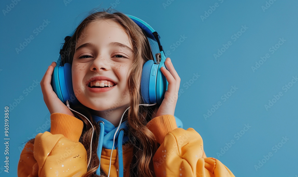 Obraz Instrumenty Muzyczne - Portret uśmiechniętej dziewczynki w słuchawkach na niebieskim jednolitym tle #903193850