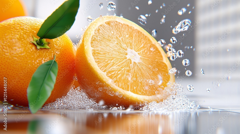 • Dwie pomarańcze pokryte kroplami wody, jedna przekrojona na pół, soczysta i apetyczna na białym tle.