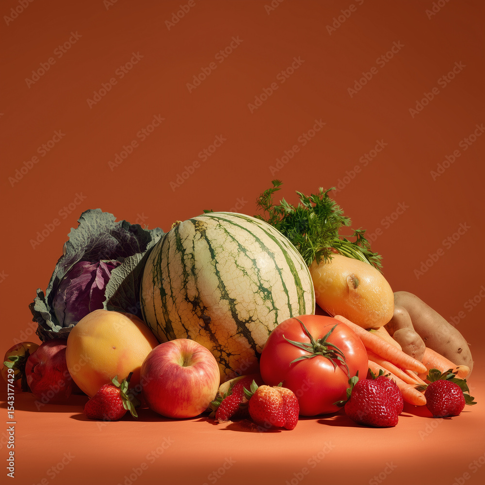 • Kolorowy zbiór świeżych owoców i warzyw, w tym arbuz, kapusta, marchew i truskawki, leży na pomarańczowym tle. Obfitość natury i zdrowia.