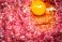• Surowe mielone mięso wieprzowe a na nim rozbite jajko. Wszystko przyprawione solą i pieprzem.