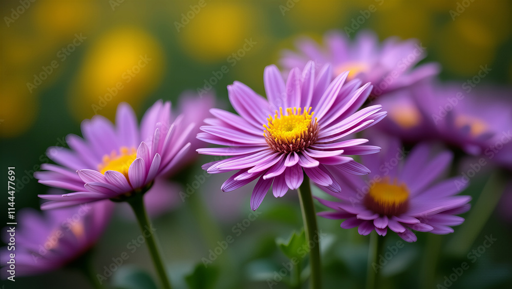 Obraz Kwiaty - Fioletowe kwiaty stokrotek kwitnące w żywym zielonym ogrodzie #1144477691