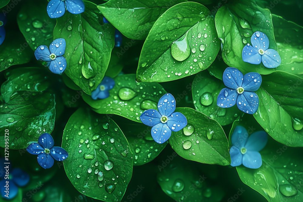 Obraz Kwiaty - Zbliżenie na żywe niebieskie kwiaty i zielone liście ozdobione kroplami wody #1271095720
