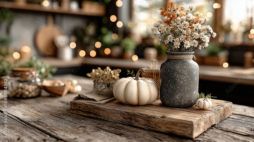 Obraz Kwiaty - Kompozycja jesiennych dekoracji na drewnianym stole: biała dynia, wazon z kwiatami i lampki... #1696984382