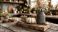 • Kompozycja jesiennych dekoracji na drewnianym stole: biała dynia, wazon z kwiatami i lampki tworzą przytulną atmosferę.