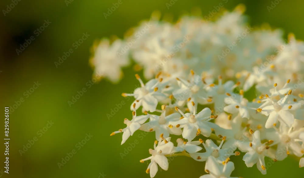 • W wiosenny dzień zakwitły białe kwiaty czarnego bzu. Biała chmura kwiatów rośliny o wyjątkowych właściwościach zdrowotnych.