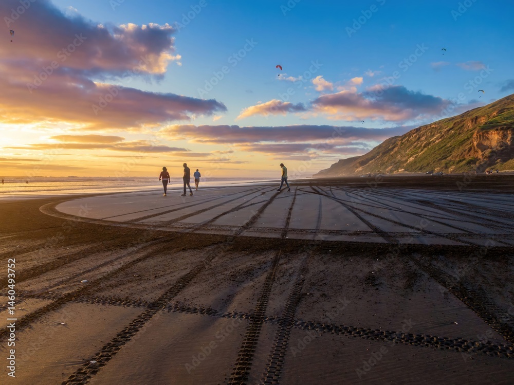 • People walk and enjoy paragliding at sunset on Karioitahi Beach, Waiuku, Auckland, New Zealand. The black sand beach shows tire tracks from vehicles driving on the beach.