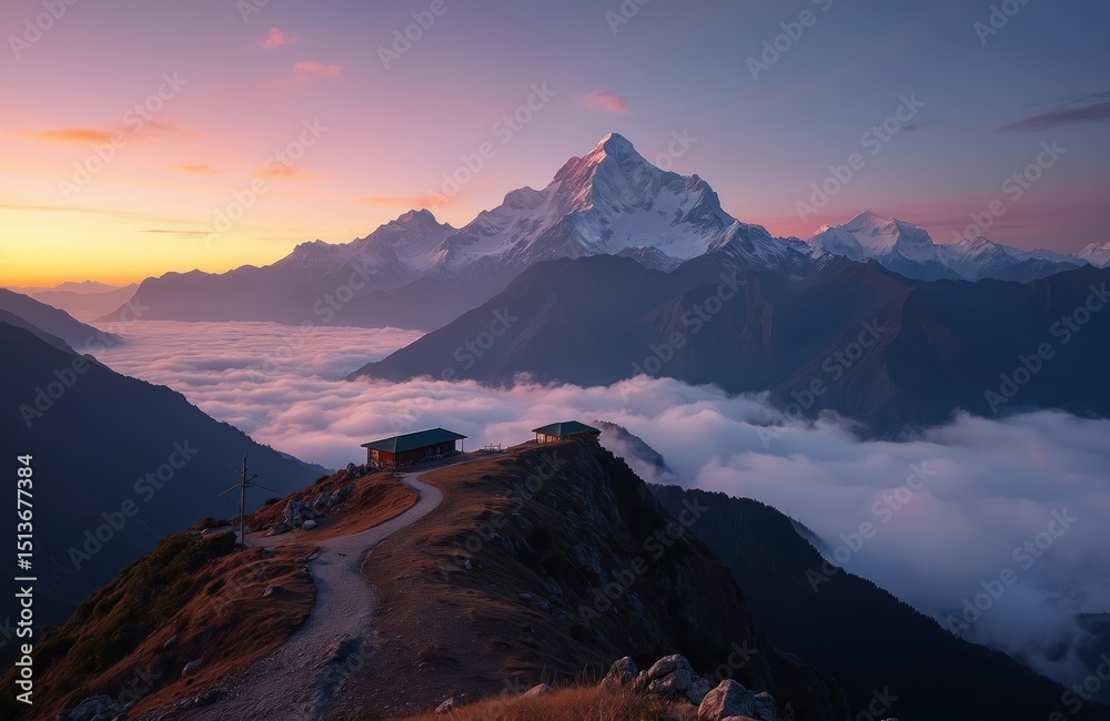 • Spectacular view of Khopra Ridge during sunset. Dhaulagiri mountain rises above sea of clouds. Annapurna Sanctuary, Nepal. Hiking route, community operated lodge Khopra Danda. Travel adventure,