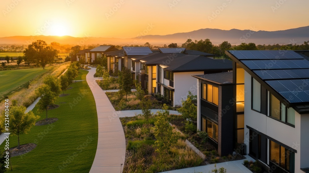 Obraz Pejzaże - Sustainable community featuring solar-equipped eco homes, walkable green neighborhoods, and lush... #1521410474