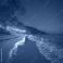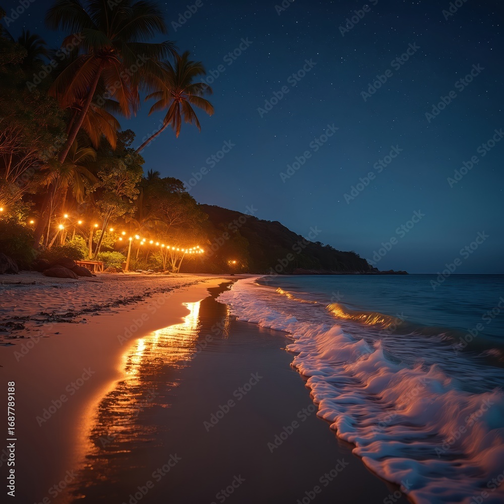 • Sophisticated beach party at night with warm flickering lights reflecting on water near jungle. Starry sky above serene tropical ocean, calm waves lap sandy shore. Enjoyment, relaxation, festive