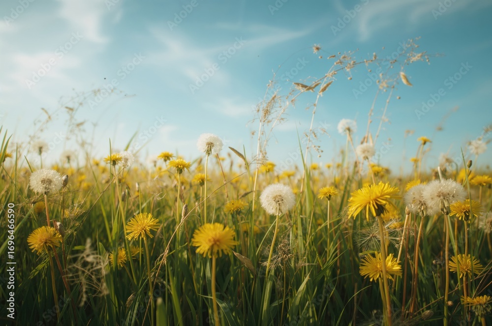• Bright Yellow Dandelion Blooms in a Lush Green Meadow