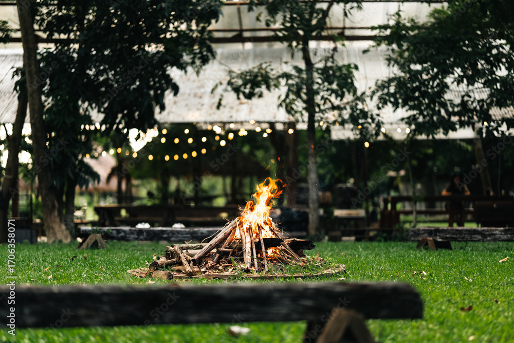 • Campfire area surrounded by wooden benches and lush greenery in outdoor nature setting, perfect for group gathering, relaxation, eco-living, forest camping experience, and rustic open-air adventure