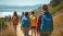 • Group of high school students hike on coastal trail during field trip. Backpacking through nature, learning ecology, environment. Enjoying outdoor education, scenic mountain landscape, journey,