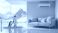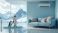 • Two penguins stand on ice floe, Antarctic landscape outside window. Modern living room with sofa and AC unit contrasts cold environment. Nature meets home comfort.