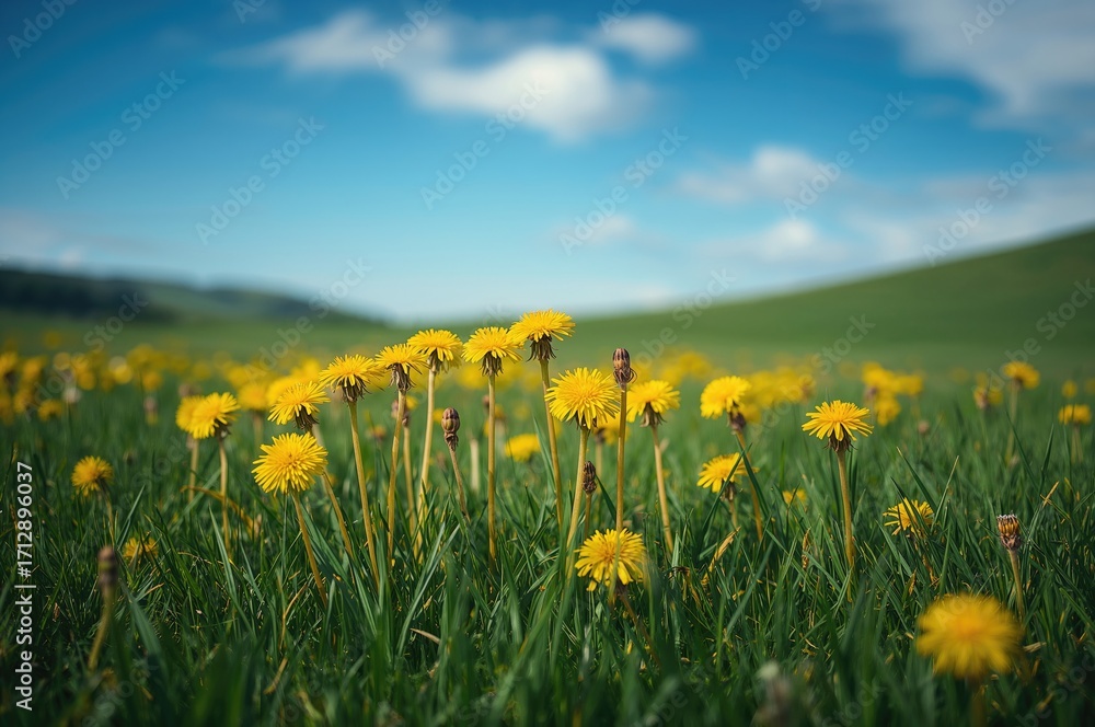 Obraz Pejzaże - Vibrant yellow dandelion blossoms against lush green grass #1712896037