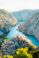 • View of the Zrmanja River Canyon in Croatia, with winding turquoise waters cutting through limestone cliffs. A scenic natural wonder popular for kayaking and hiking