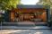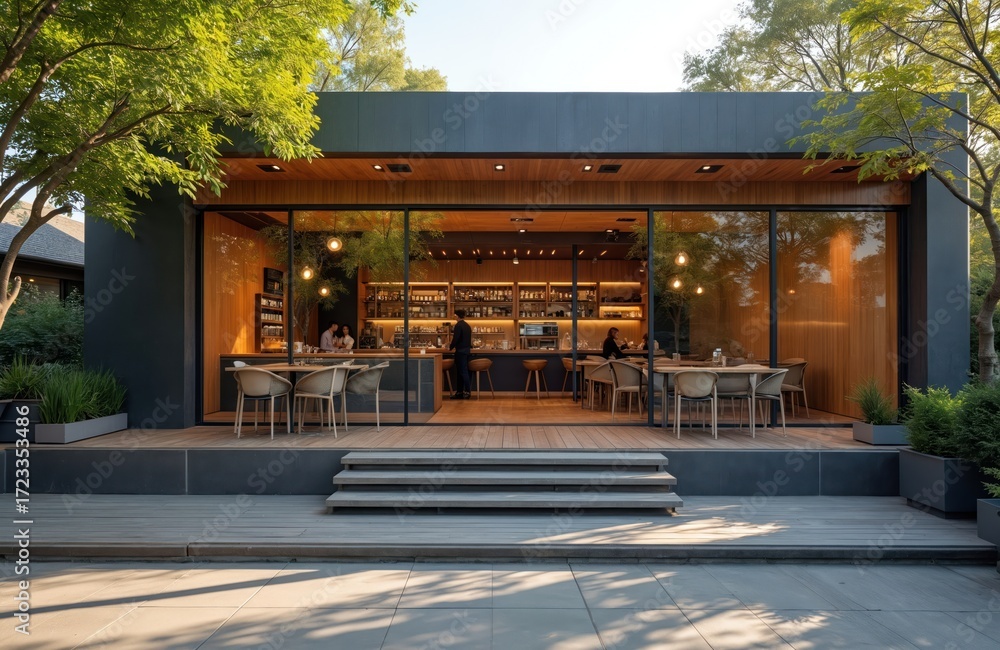 • Minimalist coffee shop exterior in bright daylight. Sleek uncluttered design, contemporary furniture. Inviting, tranquil atmosphere with elegant stylish sunlit decor. Roomy neat relaxation space on