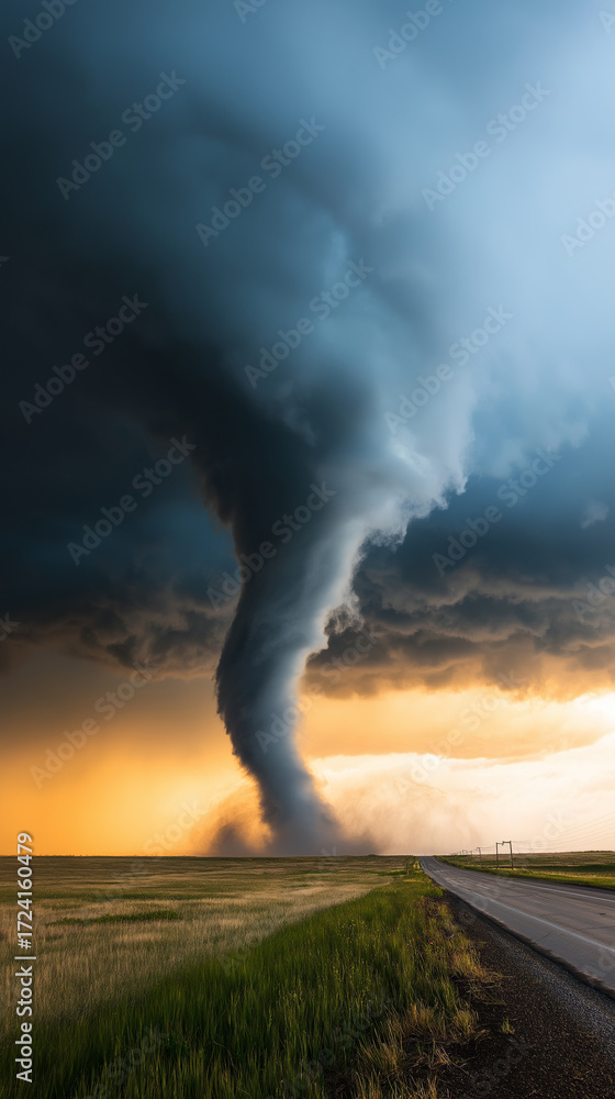 Obraz Pejzaże - Massive tornado funnel cloud approaching open landscape. #1724160479