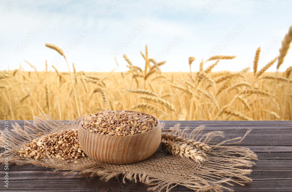 • Cereal grains and ears of wheat on wooden table against agricultural field