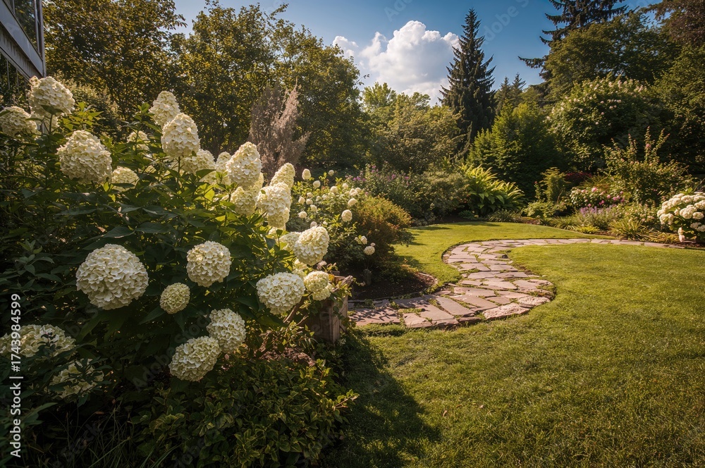 Obraz Pejzaże - Private summer garden featuring vibrant Annabelle hydrangeas, rich lawn borders, and an elegant... #1743984599