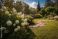• Private summer garden featuring vibrant Annabelle hydrangeas, rich lawn borders, and an elegant walkway. Landscape architecture.