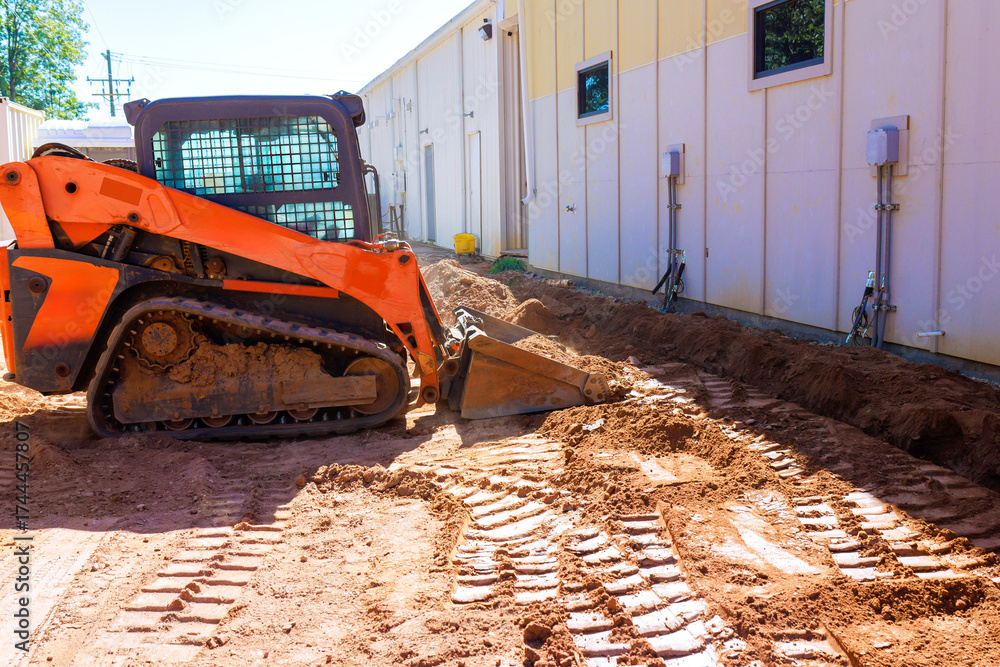 Obraz Pejzaże - Heavy bulldozer machinery is digging leveling soil beside building #1744457807