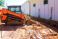 • Heavy bulldozer machinery is digging leveling soil beside building