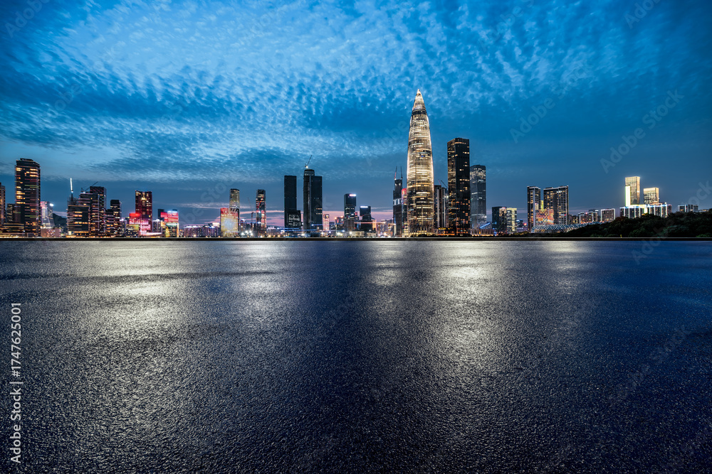 Obraz Pejzaże - Empty asphalt road with the illuminated modern city skyline at night in Shenzhen, China. #1747625001