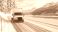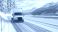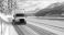 • Winter truck driving on snowy road with mountains and lake scenery