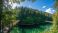 • Sunny summer day at a scenic suspension bridge surrounded by lush greenery