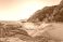 Aerial view of mineral mining evaporation ponds. Industrial landscape with brine pools reflects sunset light. Eco tech for lithium extraction in desert mountains. Critical raw material for electric