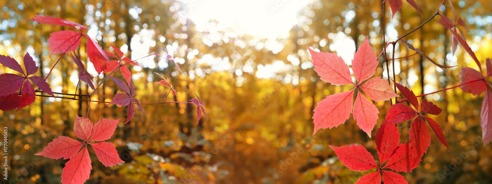 bright red leaves of wild grapes outdoor, sunny abstract landscape. beautiful autumn nature background. fall season. artistic nature image with plant leaves. banner. copy space od 0,00 zł Dopasuj i kup
