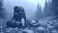 • Close up photo shows essential hiking camping gear. Backpacks sleeping bags water bottle cameras lay on the ground. Background features misty forest terrain adventure equipment.