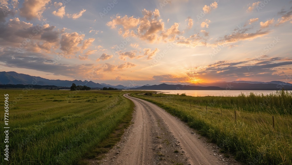 Obraz Pejzaże - Sunset over a lakeside dirt path in a rural area #1772650965