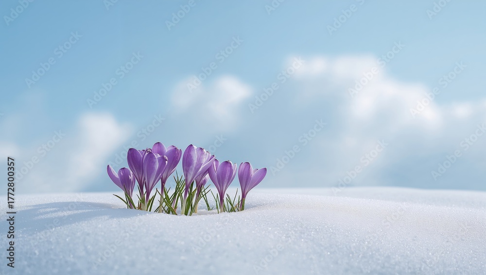 Crocus blossoms emerging through snowy ground. Natural floral backdrop. Wide format banner od 0,00 zł Dopasuj i kup