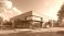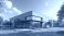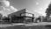 • Modern small commercial office building under clear blue sky. Red brick exterior large glass windows, shaded entrance. Paved parking lot, green lawn, mature trees surround appealing commercial