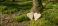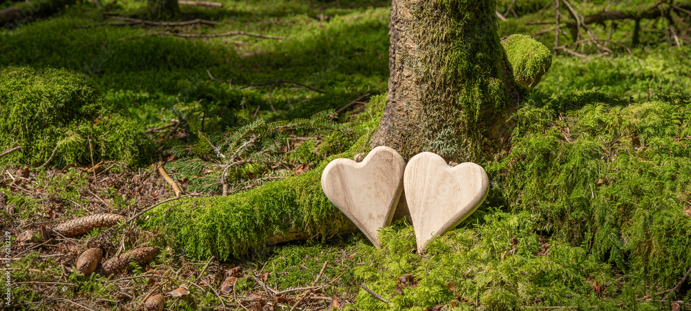 • Funeral wooden Heart near a fir spruce tree. Natural burial grave in the forest woods. Wood hearts on grass or moss. Tree burial