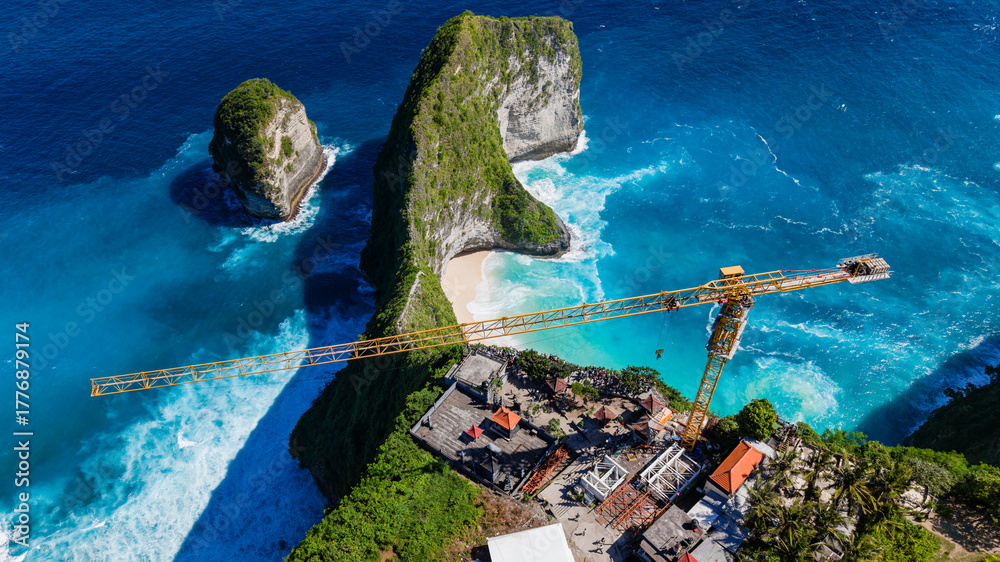 • Aerial drone view of Kelingking Beach with construction crane on clifftop
