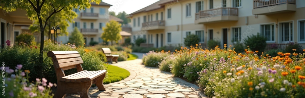 Obraz Pejzaże - Exterior view of retirement community building with benches and garden. Stone path leads through... #1778006024
