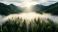 • Misty valley with soft morning light illuminating lush green trees, creating tranquil atmosphere