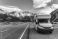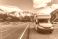 • Motorhome parked on roadside with Mount Cook over road in autumn at New Zealand