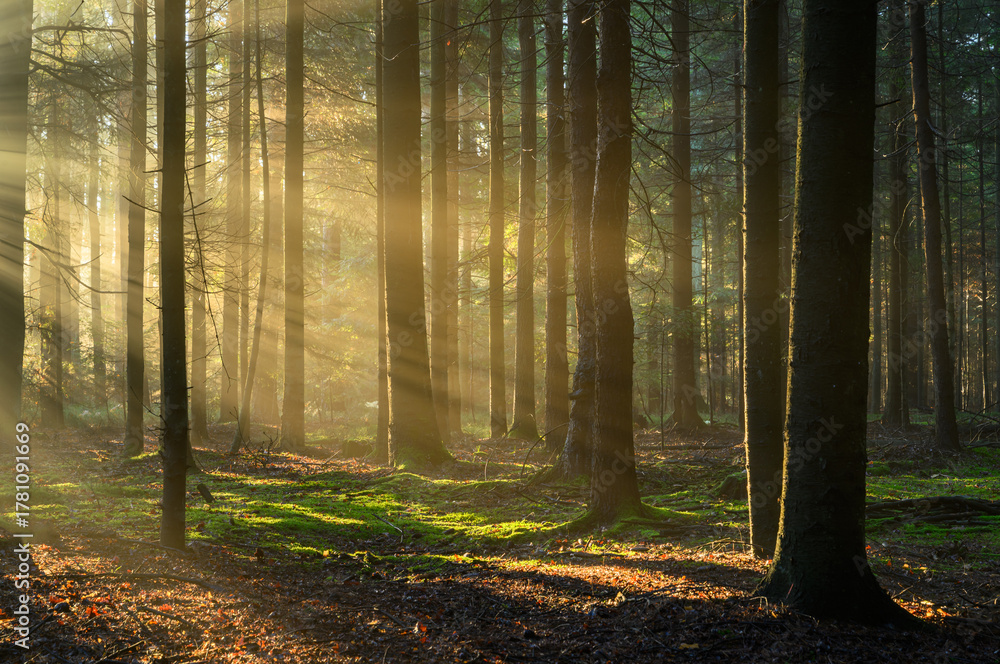 Obraz Pejzaże - Beautiful sunny morning in green forest #1781091669