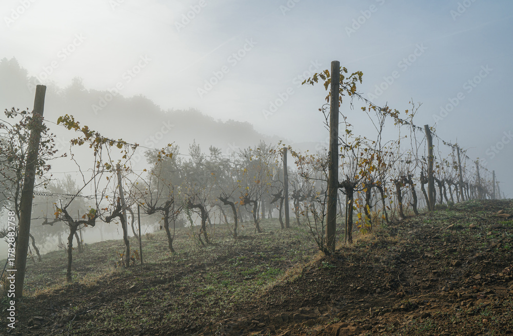 • Beautiful misty early morning vineyard landscape. Farm winery covered with cold autumn fog in Italian countryside, showcasing tranquil rural scenery and agricultural beauty of late October. Tuscany.